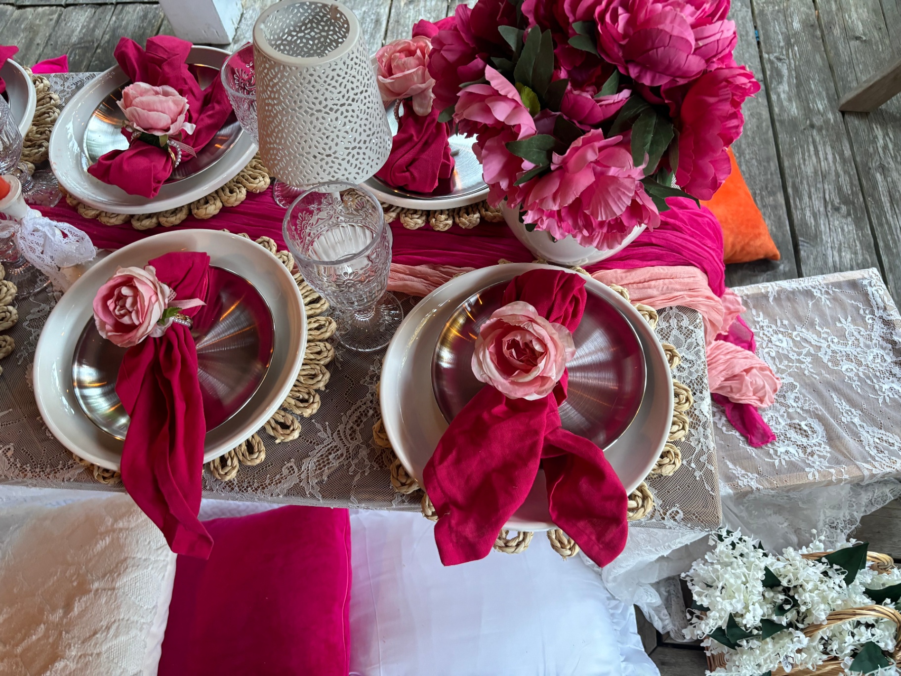 Ten‑course Mediterranean BBQ; garlic‑rosemary steak; heart‑shaped celebration cake.